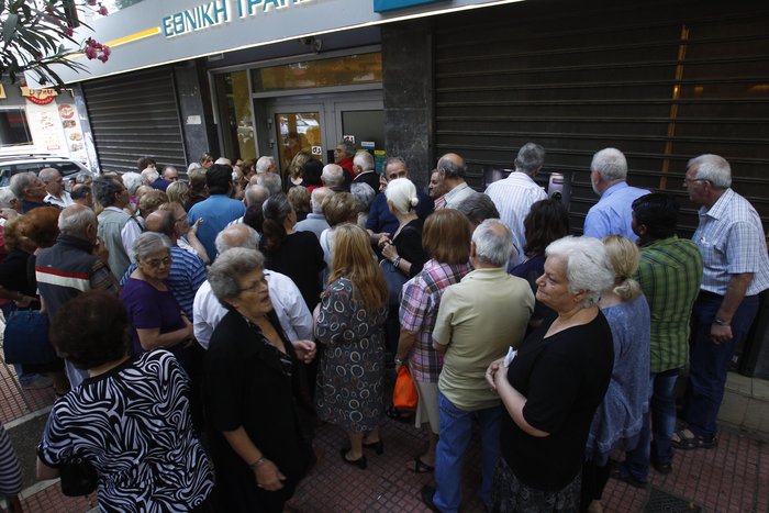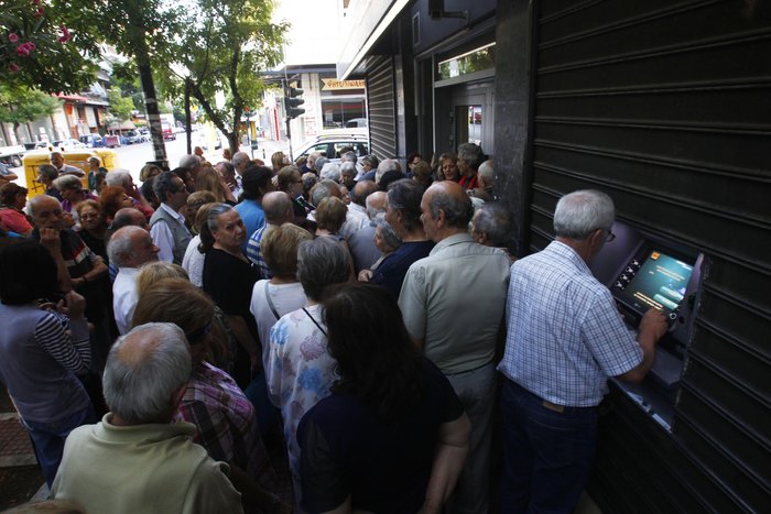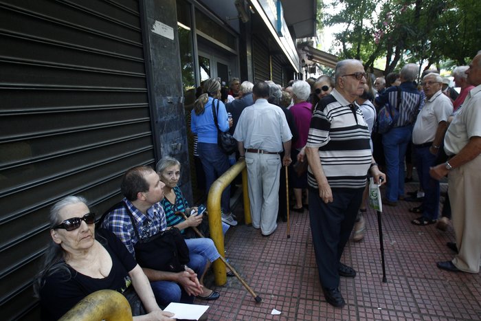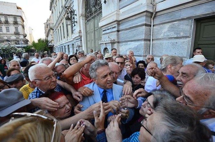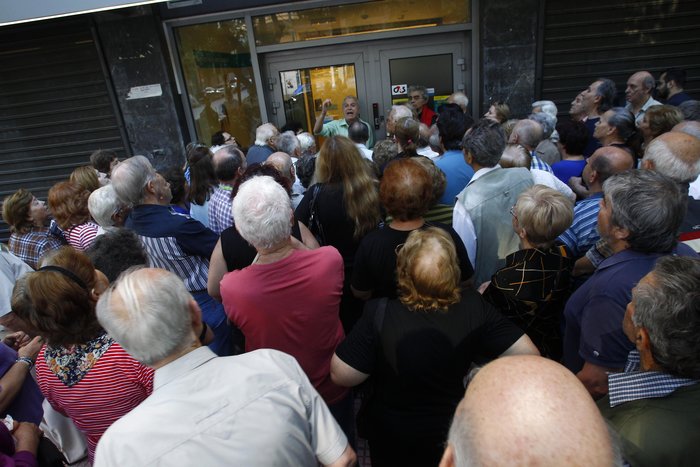Αγανάκτηση, εξάντληση, αγωνία ακόμα και λιποθυμίες από χιλιάδες συνταξιούχους που περιμένουν στις ατέλειωτες ουρές από τα ξημερώματα έξω από τα 968 υποκαταστήματα τραπεζών που άνοιξαν προκειμένου να πάρουν 120 ευρώ από τις συντάξεις τους... αλλά αλφαβητικά! Πρόκειται για συνταξιούχους που δεν διαθέτουν χρεωστική κάρτα ή κάρτα ανάληψης μετρητών από ΑΤΜ και οι οποίοι θα πρέπει να περάσουν από το γκισέ μιας εκ των 968 τραπεζών που θα λειτουργήσουν μέχρι την Παρασκευή για να εξυπηρετηθούν. Με απόφαση που ελήφθη αργά τη νύχτα οι τράπεζες Εθνική, Alpha και Eurobank θα εξυπηρετούν με αλφαβητική σειρά. Ηδη από τις πρώτες πρωϊνές ώρες διαδραματίζονται απίστευτες σκηνές έξω από τα υποκαταστήματα με λιποθυμίες ηλικιωμένων. Σε απόγνωση βρίσκονται, και οι υπάλληλοι των τραπεζών.