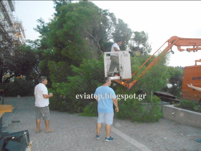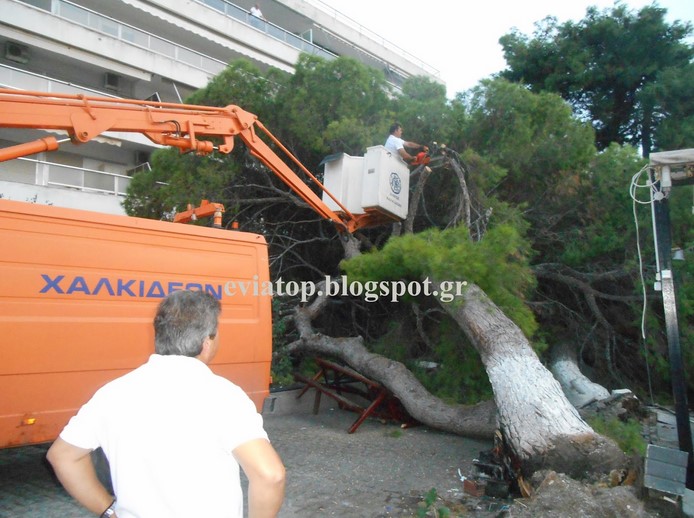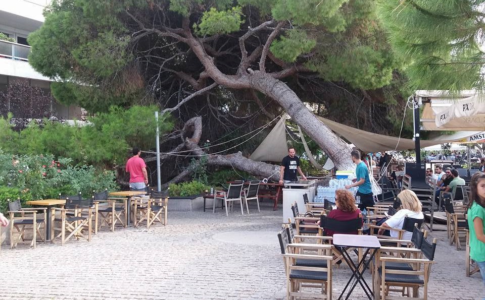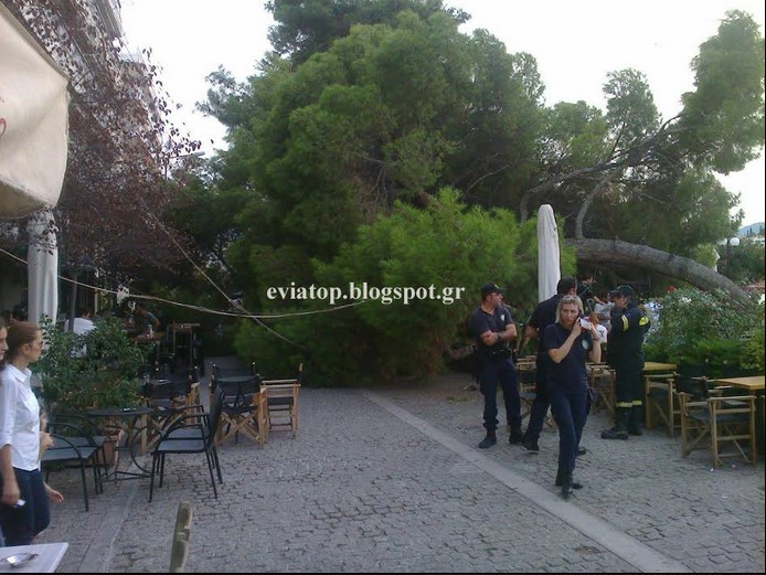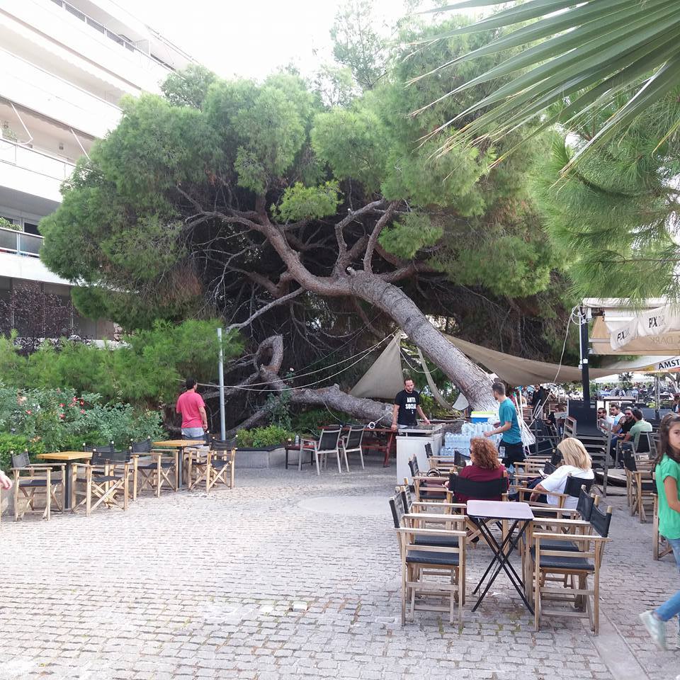 Συνέβη νωρίς το απόγευμα της Κυριακής σε πεζόδρομο της Χαλκίδας. Το τεράστιο πεύκο έγειρε και έπεσε πάνω στα τραπεζάκια της καφετέριας.