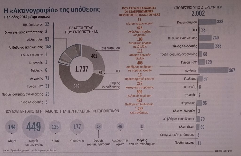 Σύμφωνα με τα επίσημα στοιχεία του Σώματος Επιθεωρητών Ελεγκτών Δημόσιας Διοίκησης (ΣΕΕΔΔ) που παρουσιάζει η «Καθημερινή», από το 2014 μέχρι και τον Οκτώβριο του 2018 έχουν εντοπιστεί 1.737 πλαστοί τίτλοι στο Δημόσιο και οι κάτοχοί τους (σ.σ. κάποιοι με δύο ή τρεις πλαστούς τίτλους) έχουν απολυθεί οριστικά από τις υπηρεσίες τους, ενώ ακόμα 2.002 υποθέσεις με ισχυρές ενδείξεις πλαστότητας βρίσκονται υπό διερεύνηση.