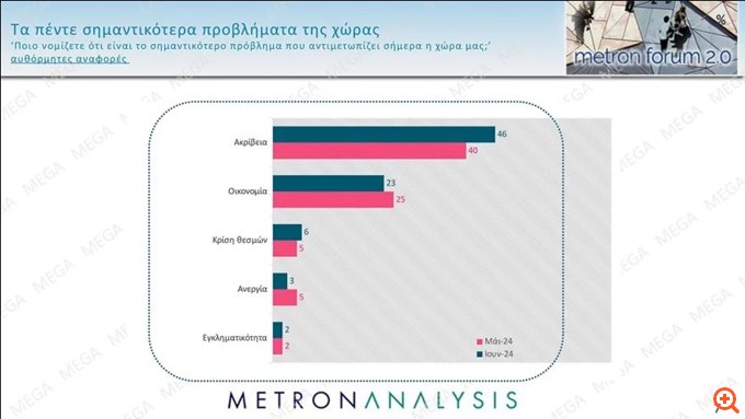 Οι πολίτες θεωρούν την ακρίβεια ως το σημαντικότερο πρόβλημα της χώρας σε ποσοστό 46%, με την οικονομία να ακολουθεί στο 23%.