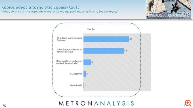 Τέλος, στο κομμάτι της αποχής από τις Ευρωεκλογές, το 42% κρίνει το γεγονός ως στάση διαμαρτυρίας για το πολιτικό σύστημα, με το 47% να μιλά για αδιαφορία για τα πολιτικά δρώμενα.