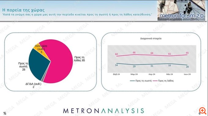 Ερωτηθέντες για το αν θεωρούν πως η χώρα κινείται στην σωστή κατεύθυνση, οι συμμετέχοντες απάντησαν αρνητικά σε ποσοστό 65%, με μόλις το 28% να κρίνει αισιόδοξα την πορεία.