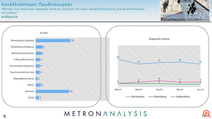 Στην καταλληλότητα για την πρωθυπουργία, ο Κυριάκος Μητσοτάκης συγκεντρώνει το 33%, μία μονάδα μπροστά από τον... κανένα. Ο Στέφανος Κασσελάκης συγκεντρώνει 7%, ο Κυριάκος Βελόπουλος το 6% προσπερνώντας τον Νίκο Ανδρουλάκη που βρίσκεται στο 4%, ποσοστό ίδιο με εκείνο των Δημήτρη Κουτσούμπα και Ζωής Κωνσταντοπούλου.